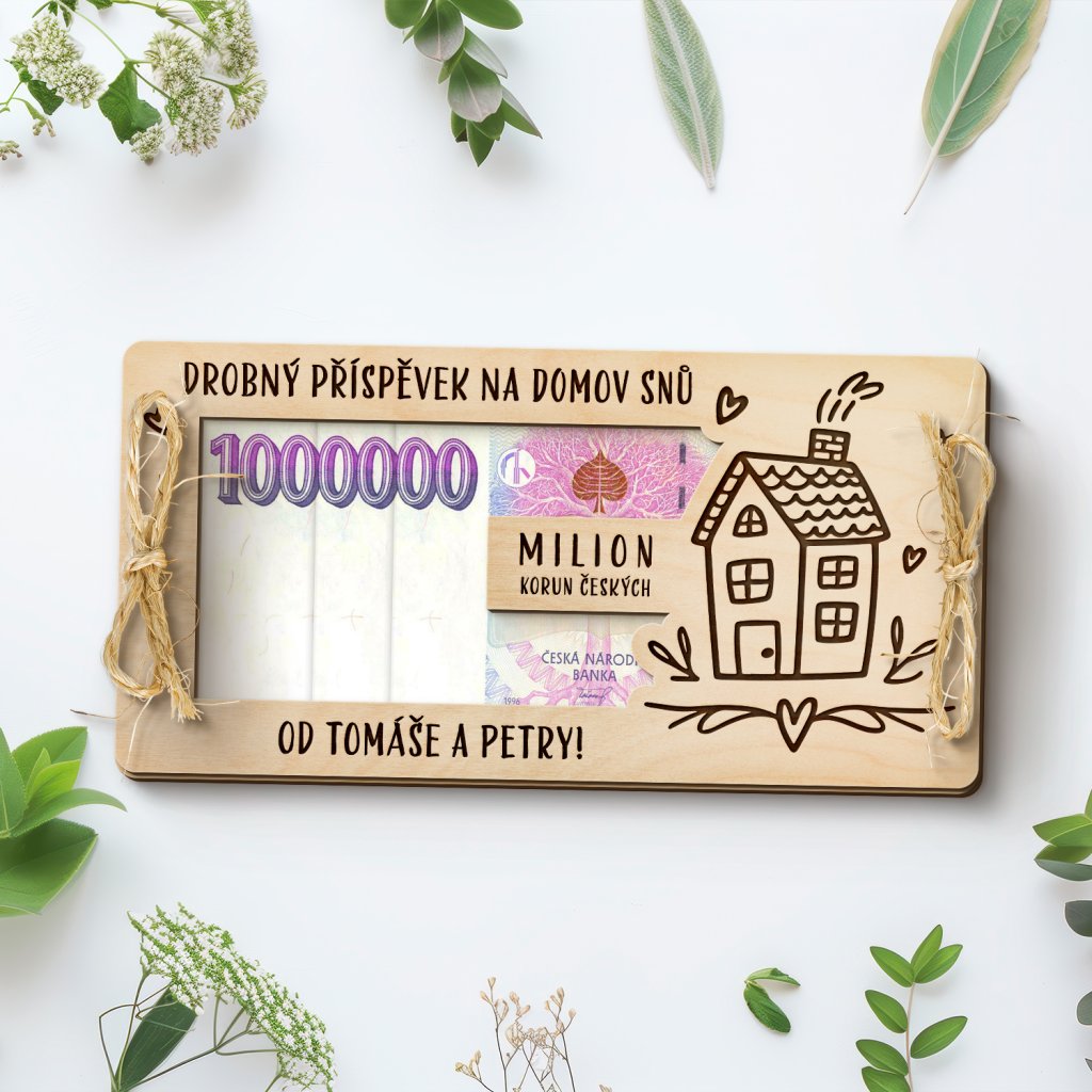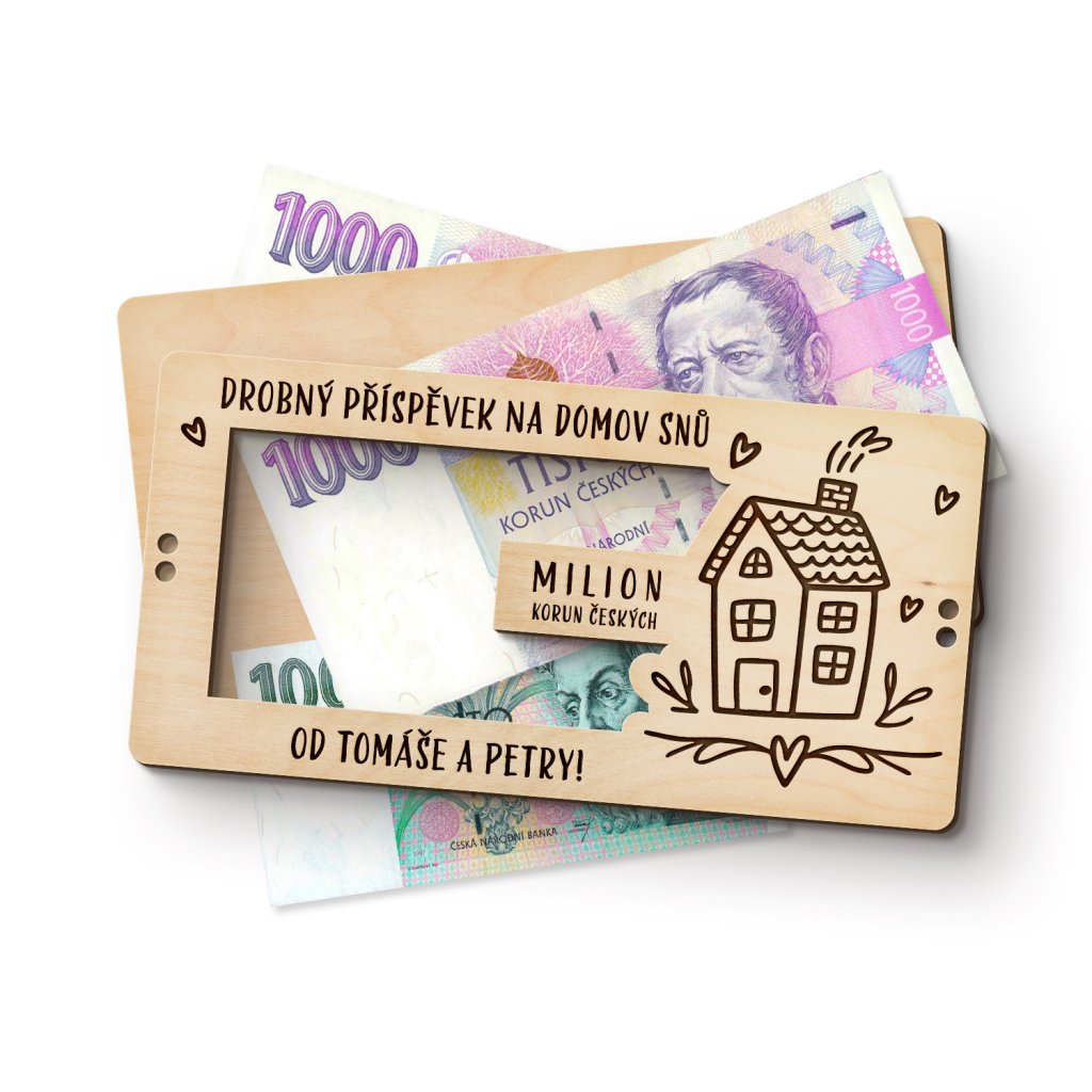 Chcete darovat peníze na narozeniny nebo Vánoce originálně? Darujte dřevěné přání s “milionem korun”. Přání se skládá ze dvou částí, do kterých můžete bankovky vložit originálním způsobem. Dárkovou kartu lze navíc obohatit vzkazem na míru, čímž přidáte osobní dotek, a hodnotu bankovek si můžete navolit sami. Doporučujeme, aby první bankovka začínala číslicí 1, což symbolicky vytvoří “milionový” dar.