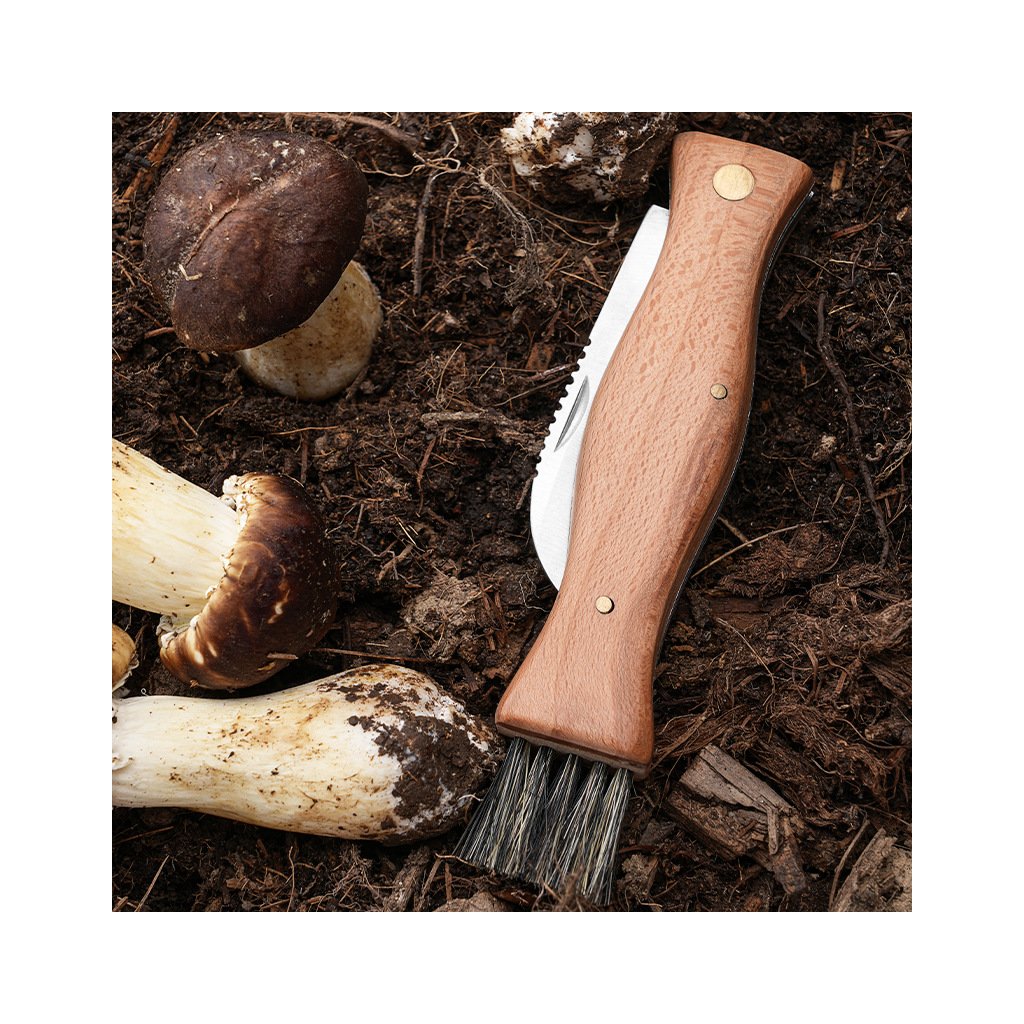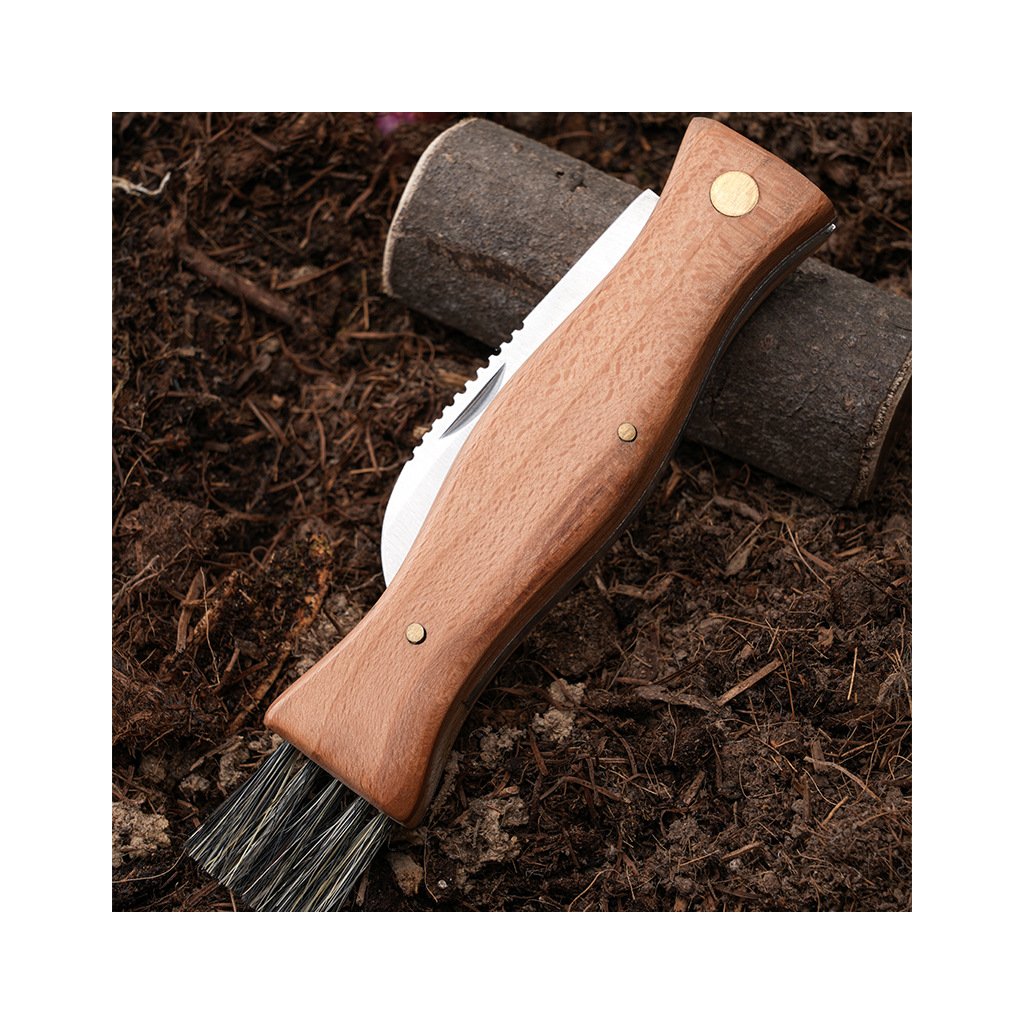 Houbařský nůž s dřevěnou rukojetí a štětečkem