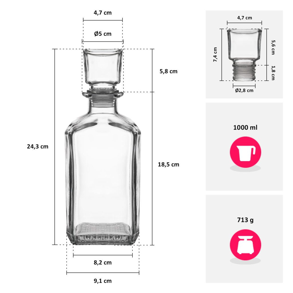 - Skleněná zátka: dokonale těsní, chrání aroma a chuť nápoje, dodává karafě luxusní vzhled.
