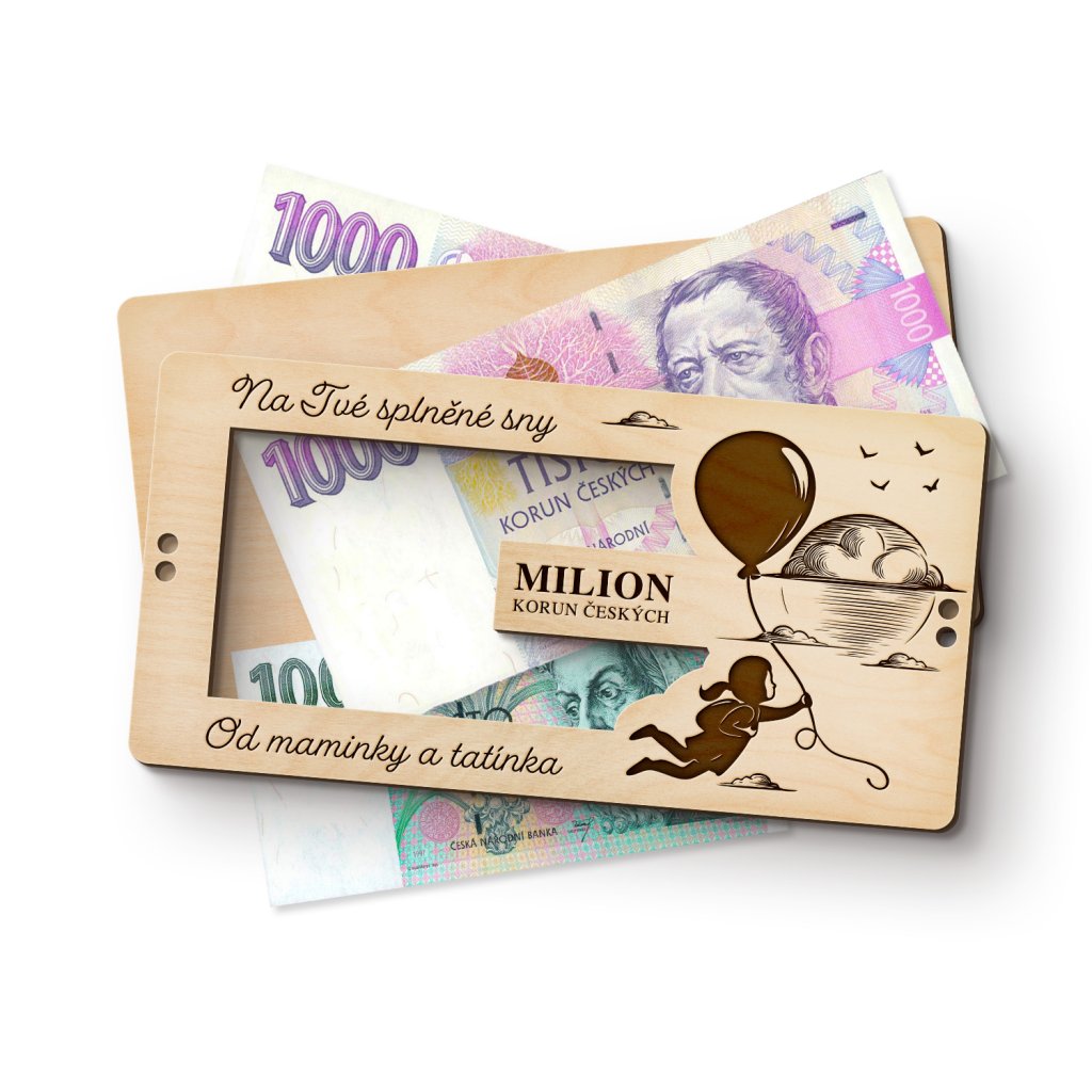 Chcete darovat peníze na narozeniny nebo Vánoce originálně? Darujte dřevěné přání s “milionem korun”. Přání se skládá ze dvou částí, do kterých můžete bankovky vložit originálním způsobem. Dárkovou kartu lze navíc obohatit vzkazem na míru, čímž přidáte osobní dotek, a hodnotu bankovek si můžete navolit sami. Doporučujeme, aby první bankovka začínala číslicí 1, což symbolicky vytvoří “milionový” dar.