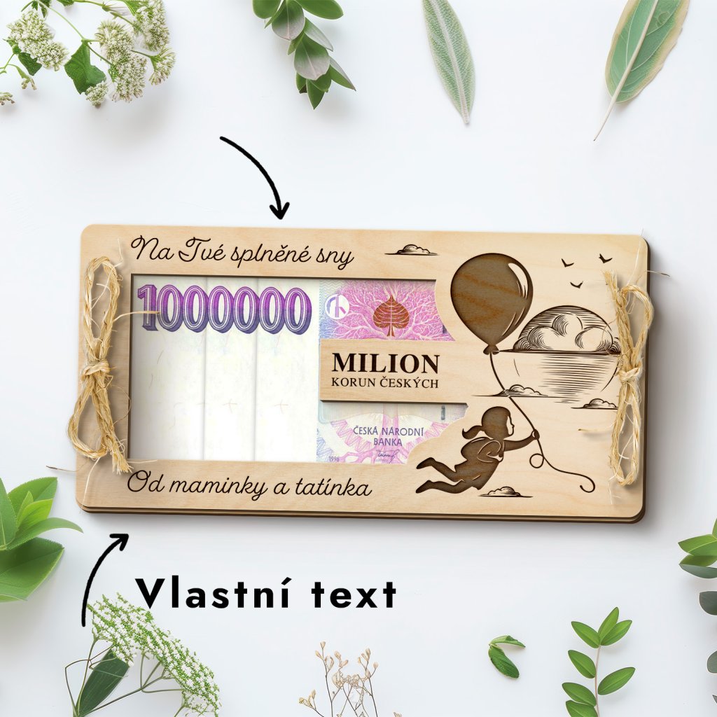 Darujte dřevěné přání s “milionem korun”. Přání se skládá ze dvou částí, do kterých můžete bankovky vložit originálním způsobem. Dárkovou kartu lze navíc obohatit vzkazem na míru, čímž přidáte osobní dotek, a hodnotu bankovek si můžete navolit sami.