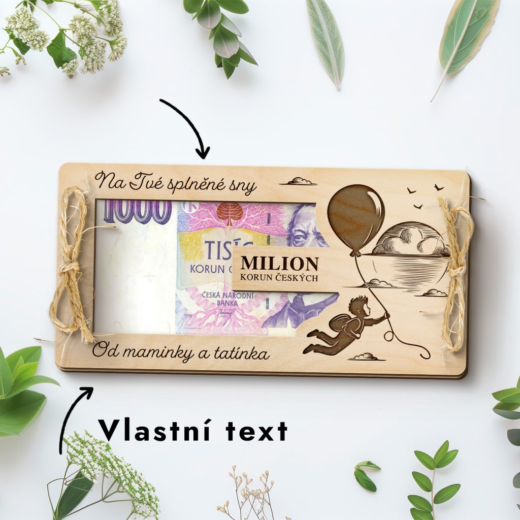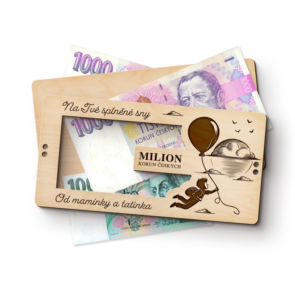 Darujte dřevěné přání s “milionem korun”. Přání se skládá ze dvou částí, do kterých můžete bankovky vložit originálním způsobem. Dárkovou kartu lze navíc obohatit vzkazem na míru, čímž přidáte osobní dotek, a hodnotu bankovek si můžete navolit sami.