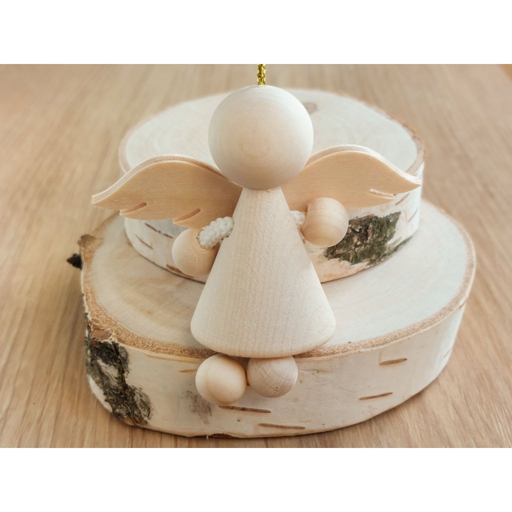 Andělská ozdoba je vyrobena z bukového dřeva a březové překližky, což zajišťuje nejen estetickou hodnotu, ale i odolnost. Je k dispozici v přírodní barvě, která podtrhuje její přirozenou krásu a symboliku.